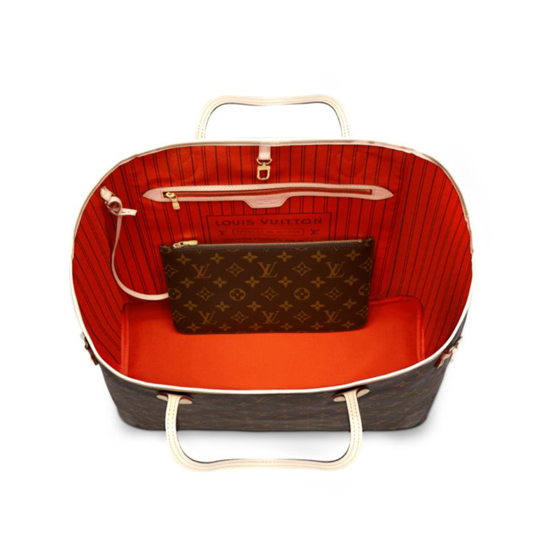 Louis Vuitton celebrates the Neverfull with a new version of this iconic bag. Look inside to discover a host of refinements. The redesigned interior features a fresh textile lining and heritage details inspired by House archives. Best of all, the removable zippered clutch can be carried separately as a chic pochette or serve as an extra pocket. Linings in a selection of bright shades lend a pop of vivid color to the timeless Monogram canvas.