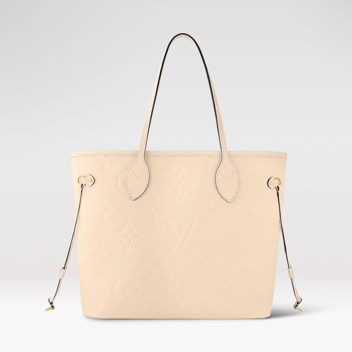 The Neverfull MM tote bag is made from grained Monogram Empreinte leather, with gold-color hardware and a tone-on-tone microfiber lining. A zipped pocket inside can be removed and used separately. The side laces can be tightened for a sleeker look or loosened for more casual use.
