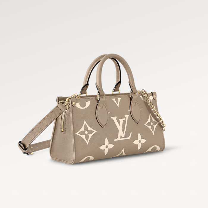 Introducing the OnTheGo East West tote, interpreted in a beautifully proportioned east-west silhouette. Made from Monogram Empreinte leather embossed with a tonal Giant Monogram motif, this compact model boasts a well-organized interior for daily essentials. The bag lends itself to a variety of carry styles, thanks to its two articulated top handles and a removable chain-and-leather strap.