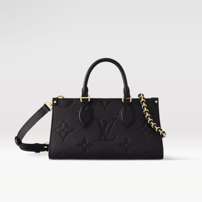 Introducing the OnTheGo East West tote, interpreted in a beautifully proportioned east-west silhouette. Made from Monogram Empreinte leather embossed with a tonal Giant Monogram motif, this compact model boasts a well-organized interior for daily essentials. The bag lends itself to a variety of carry styles, thanks to its two articulated top handles and a removable chain-and-leather strap.