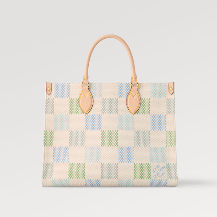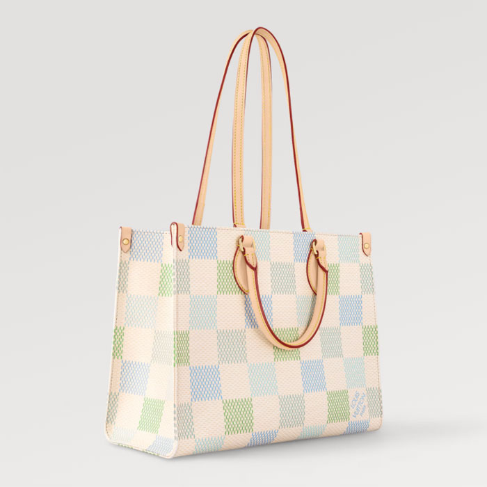 The OnTheGo MM tote bag is made from Damier Giant canvas in a charming colorway that combines four different pastel shades. In addition to two top handles in natural leather, there are two longer straps mounted inside the bag for shoulder carry. Large enough for a 13-inch laptop, this is a practical everyday bag.