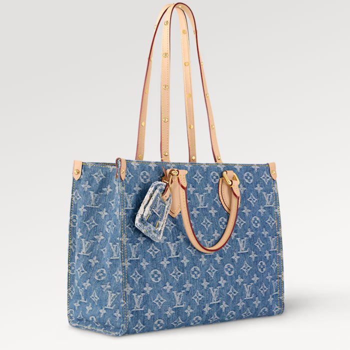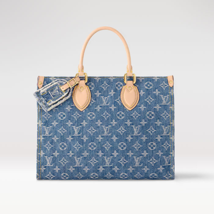 The OnTheGo MM tote bag is offered in new Monogram Denim canvas with natural cowhide-leather on the top handles and handle mounts. Thanks to the square shape, the OnTheGo has a large capacity and can hold a laptop. Its rolled-leather top handles and two longer shoulder straps enable carry options.