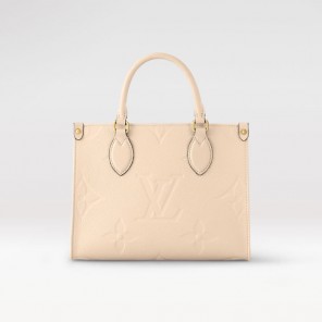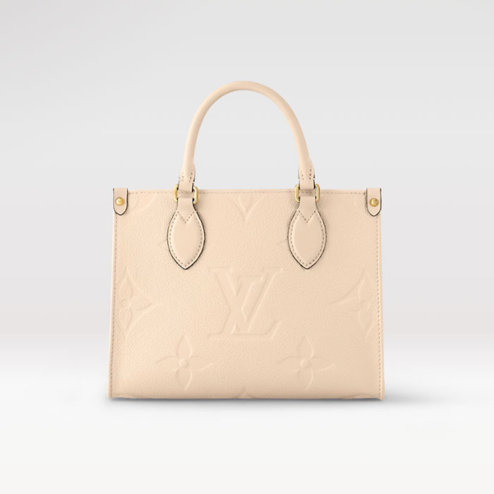 A soft cream-tone makes the Monogram Empreinte leather of this OnTheGo PM bag seem luminous. The LVs and Monogram Flowers embossed into the leather are perfectly complemented by the rectangular lines of this small tote. It can hold smaller essentials like an iPad Mini. Two rolled-leather top handles and a detachable strap give carry options