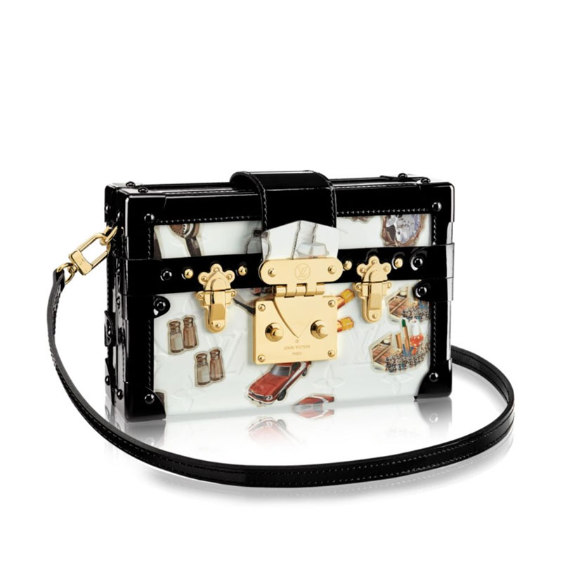This desirable Petite Malle takes its stylized pattern from Nicolas Ghesqui猫re鈥檚 runway. Crafted of printed leather, embossed for a unique tactile effect, the Malle features the reinforced corners, brass hardware and straps of an iconic Vuitton trunk. The Petite Malle Stickers goes from day to evening, thanks to a detachable leather strap.