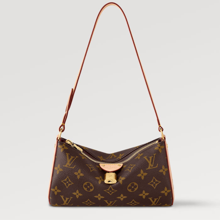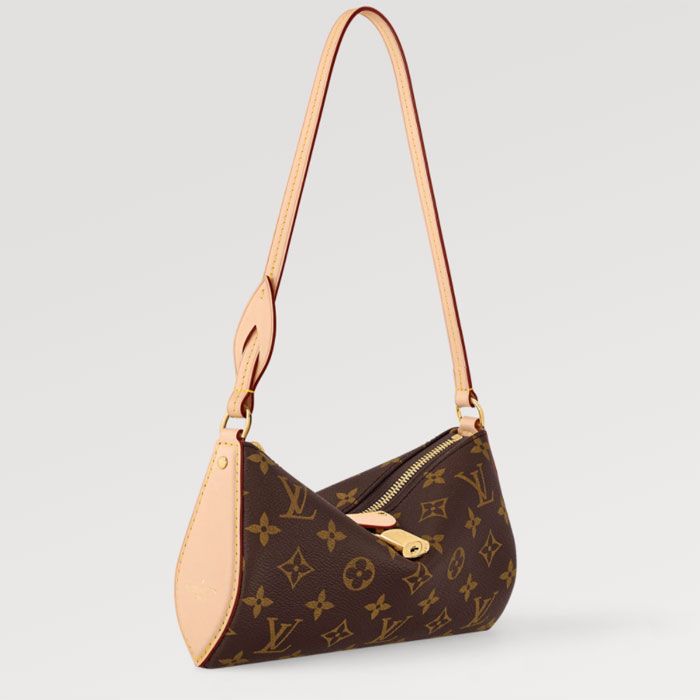 The Pochette Tirette in Monogram canvas is a small shoulder bag with an on-trend slouchy shape, which opened Louis Vuitton's Spring-Summer 2024 show. It is complemented by natural leather trim, notably on the sides, which recall the ogive shape of the House's iconic zip pulls. This model comes with a gold-tone padlock and a leather strap.