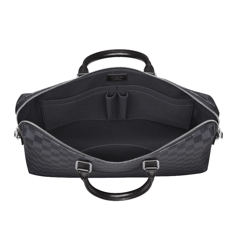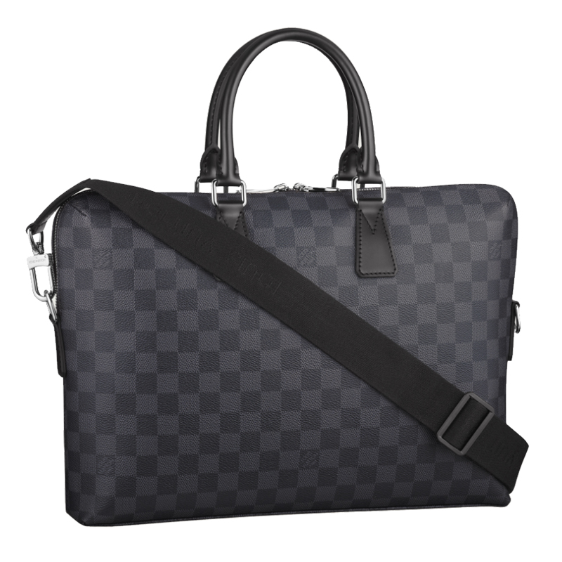 The porte-documents jour in arresting Damier graphite canvas is a more compact and casual version of the porte-documents voyage. Yet it easily carries a 15" laptop in fine style.
