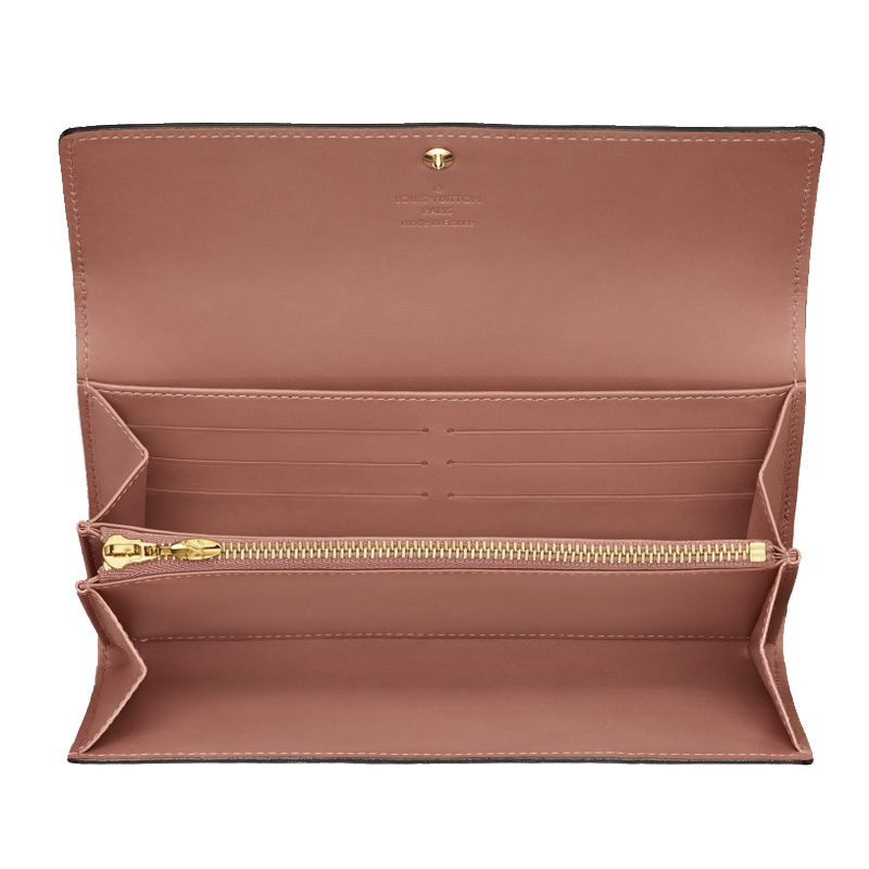 This wallet fashioned in discreetly embossed Monogram Vernis leather is feminine and compact. It features a press stud closure and is designed to hold bills and credit cards.