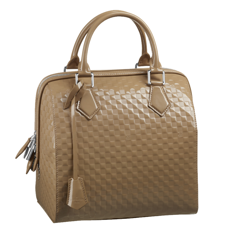 Revisited in the geometric spitit of Louis vuitton's spring/summer 2013 women's fashion show,the iconic speedy bag becomes the speedy cube in Damier facette. In brushed shiny calf leather embossed with the historic damier pattern and structured by an english frame,it makes a strong accompany a wide range of looks.