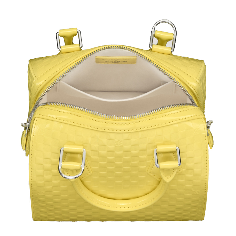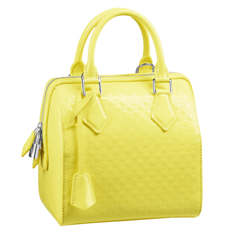 Revisited in the geometric spitit of Louis vuitton's spring/summer 2013 women's fashion show,the iconic speedy bag becomes the speedy cube in Damier facette. In brushed shiny calf leather embossed with the historic damier pattern and structured by an english frame,it makes a strong accompany a wide range of looks.
