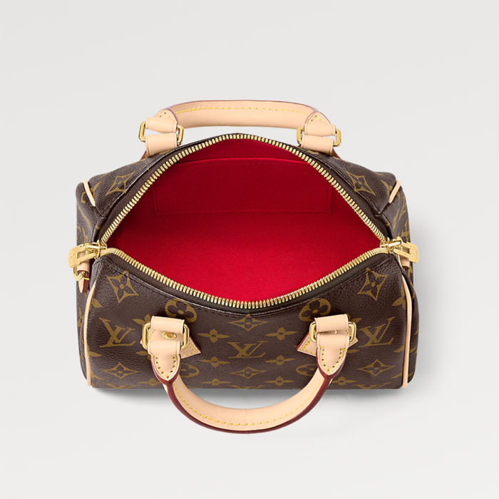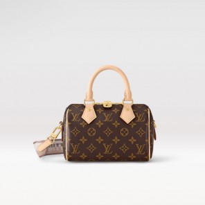 The Speedy Bandouli猫re 20 hand bag takes on classic Louis Vuitton allure in Monogram canvas with natural cowhide-leather trim and gold-color hardware. Inspired by the House鈥檚 emblematic travel bag, its distinctive shape is adorned with two rolled-leather top handles, padlock. A detachable two-color strap, signed Louis Vuitton, enables shoulder and cross-body wear.