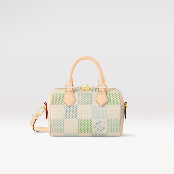 This Speedy Bandouli猫re 20 handbag is made from Damier Giant canvas in a fresh colorway that combines four different pastel shades, thanks to a precise digital printing technique. Inspired by the House鈥檚 classic travel bag, the distinctive shape has two rolled-leather top handles and a detachable and adjustable strap for shoulder and cross-body wear.