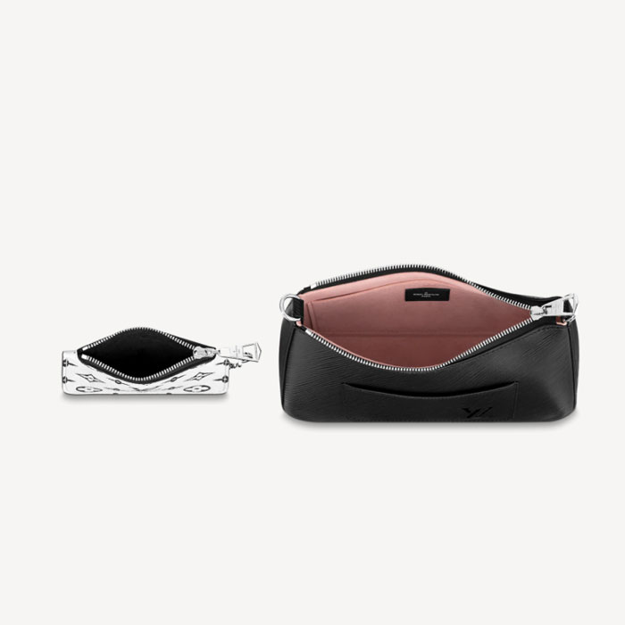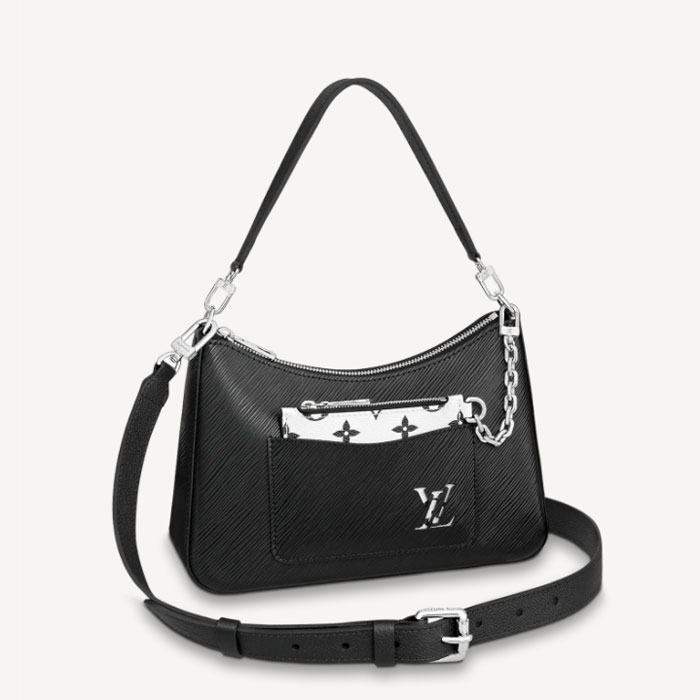 The Marelle handbag is fashioned from grained Epi leather with a detachable canvas pouch that sits in an outside pocket and is attached to the bag with a chain. The Marelle can be carried by hand, elbow or shoulder with its detachable top handle, or worn as a cross-body thanks to its removable and adjustable leather strap.