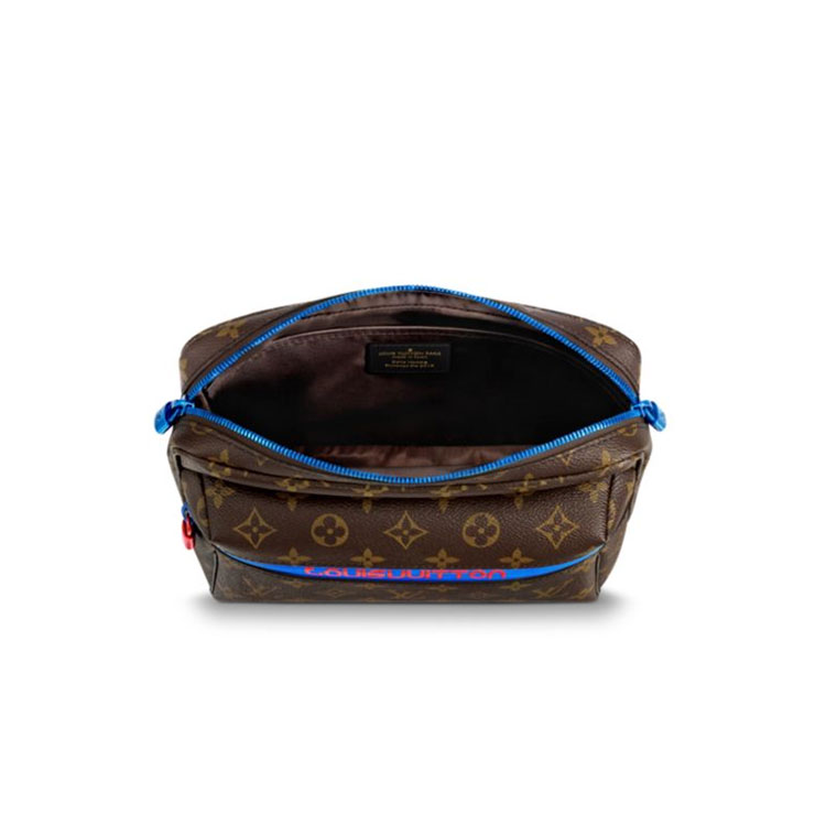 Featuring the new technical, sports-inspired feel unveiled by Kim Jones at the 2018 Spring-Summer Show, this Messenger Monogram Outdoor mixes classic Monogram coated canvas with sports webbing, scuba zips, cording and blue and green colored metallic pieces. Easy and functional crossbody shape.