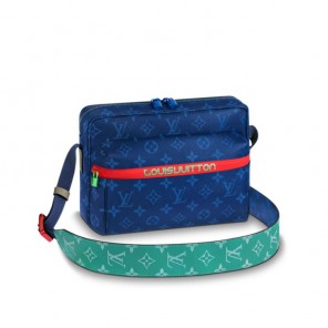 Designer Kim Jones’ new take on the Messenger PM is a sports-inspired bag that mixes LV coated canvas with sports webbing, scuba zips, cording and colorful hardware. This Messenger PM is ideally sized for business use.