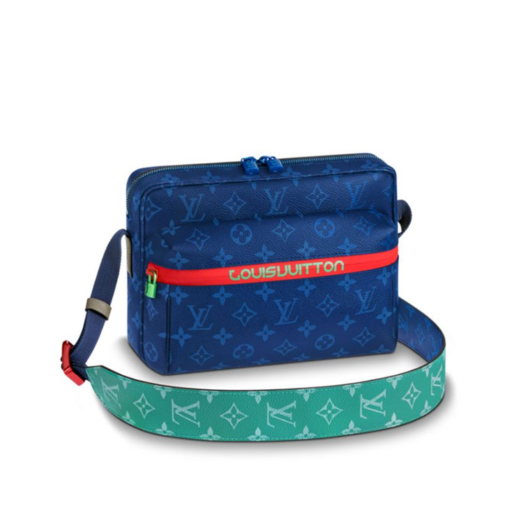 Designer Kim Jones’ new take on the Messenger PM is a sports-inspired bag that mixes LV coated canvas with sports webbing, scuba zips, cording and colorful hardware. This Messenger PM is ideally sized for business use.
