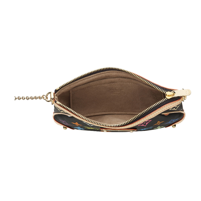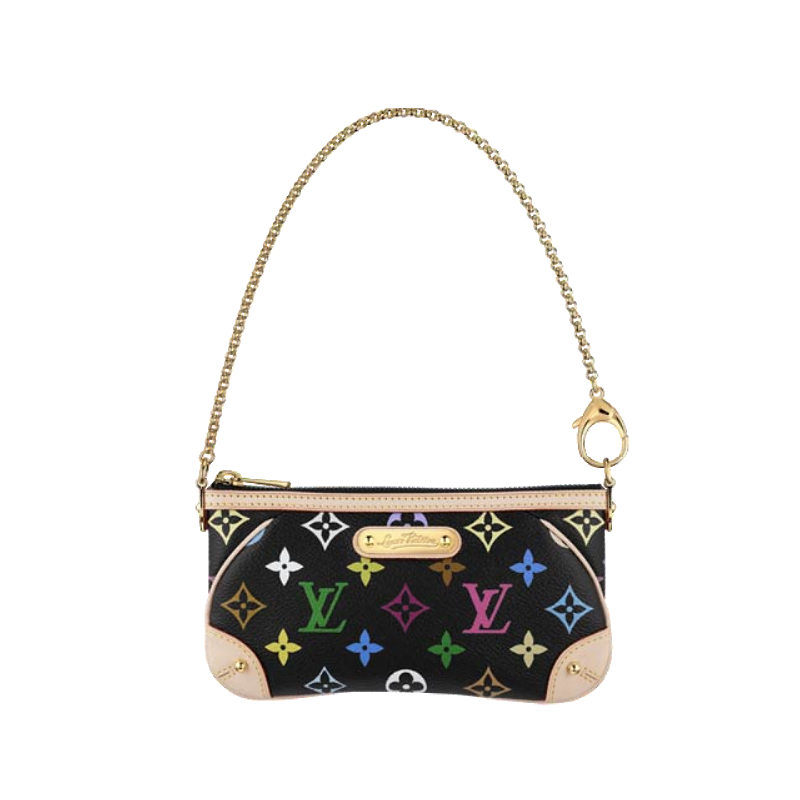 This clutch is crafted in Monogram MultiColore canvas created by Takashi Murakami. It can be carried on the wrist thanks to a golden metal chain.