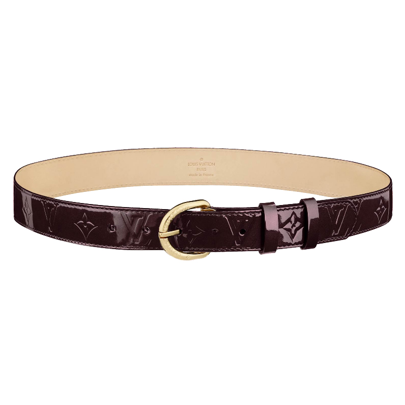Coordinating with Louis Vuitton's Monogram Vernis leather goods line, this stylish belt in rich, glossy Colors adds a touch of vibrant femininity to any outfit.