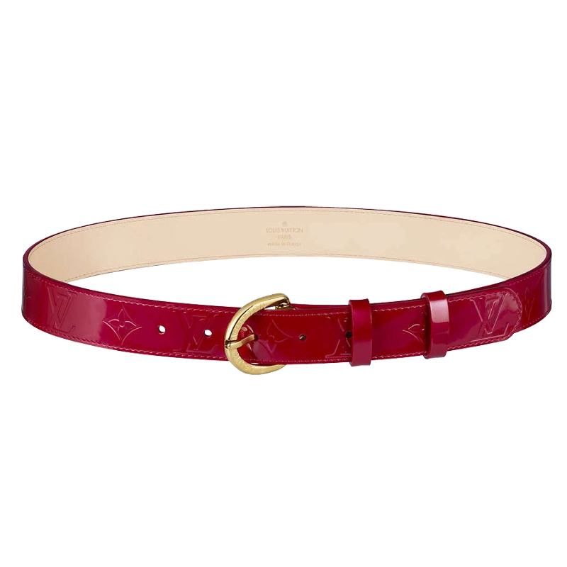 Coordinating with Louis Vuitton's Monogram Vernis leather goods line, this stylish belt in rich, glossy Colors adds a touch of vibrant femininity to any outfit.