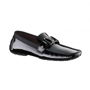 Louis Vuitton's iconic initials loafer is revisited in sophisticated patent leather with a silvery brass and black lacquer monogram. It features hand-stitched uppers and a supple padded rubber sole.