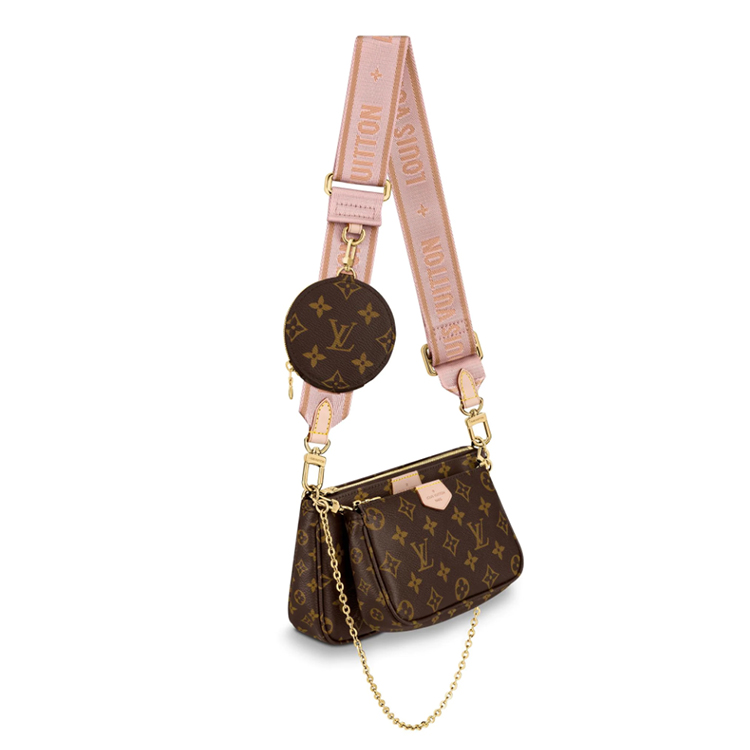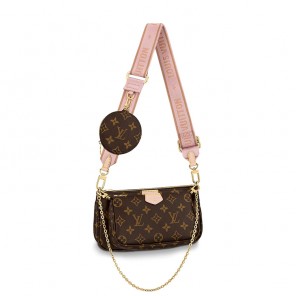 The Multi Pochette Accessoires is a hybrid cross-body bag with multiple pockets and compartments that brings together a Pochette Accessoires, a Mini Pochette Accessoires and a Round Coin Purse. Fashioned from Monogram canvas with a mini Monogram pattern on the sides of the two pochettes, it has both a removable gold-tone chain and an adjustable Louis Vuitton inscribed Jacquard strap for multiple carrying options.