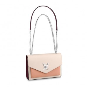 For Spring Summer 2019, the Mylockme BB bag comes in a soft summery colorway of pink, off-white, and burgundy calfskin. The luminous color combination is completed by the silver color of the signature LV turn lock and the adjustable chain strap. The chain鈥檚 leather pad brings comfortable to shoulder carry and crossbody wear.