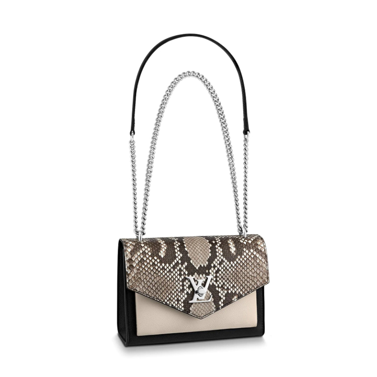The elegant Mylockme BB handbag comes in black and cream grained calf leather with a flap in natural roccia python. The envelope-style flap, which is a key detail of the Mylockme line, is secured with an LV Turn lock. This bag features an adjustable strap for shoulder or cross-body carry.