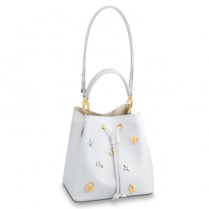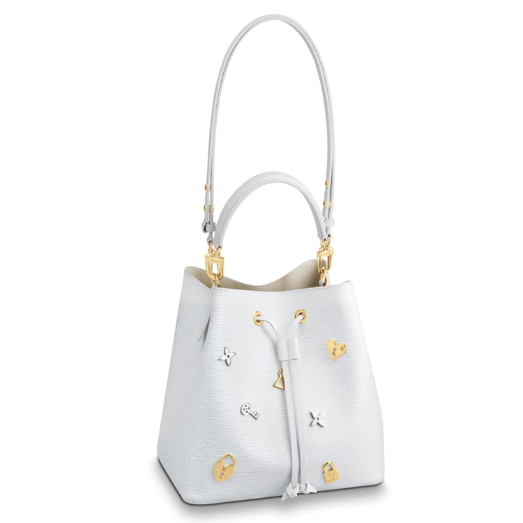 This Love Lock NeoNoe bucket bag is part of a charming capsule designed for Spring 2019. Fashioned from signature Epi grained leather, it is embellished with romantic talismans that are also symbols of the House: locks, keys and Monogram Flowers. The Love Lock theme plays out on selected handbags and leather goods this season. Definitely collectible!