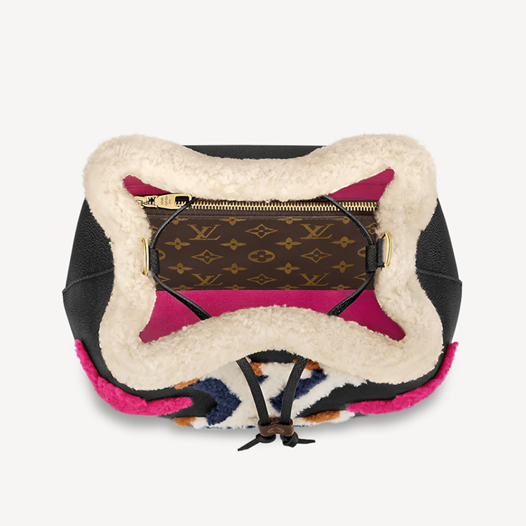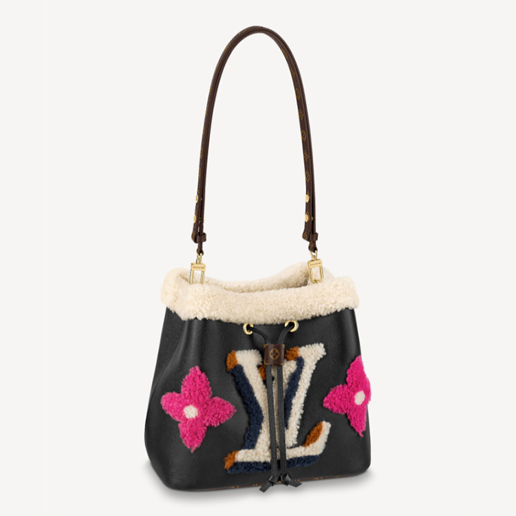 The N茅oNo茅 is fashioned from grained leather and shearling, bringing an aviator feel to this classic bucket bag. The shearling, dyed cream, blue, caramel and pink, is used to create giant LV Initials and Monogram Flowers on the black leather. This lightweight bag has a removable strap for a shoulder or cross-body carry.