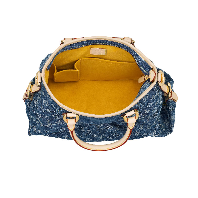 - Monogram Denim, natural cowhide trimmings in the blue denim version and grained black calf leather, in the black denim version, saffron microfiber lining