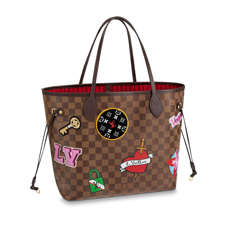 Louis Vuitton’s Neverfull MM handbag explores the House’s travel legacy with its modern take on vintage luggage “stickers”. A combination of smooth leather and Damier Ebene canvas with printed and embroidered patches create a playful feel. The bag’s side-leather laces and snap-hook closing keep essentials secure inside.