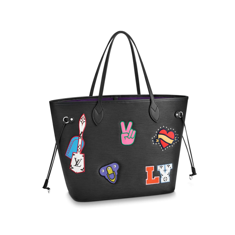The Neverfull MM handbag explores the House’s travel and trunk-making roots. Crafted from grained Epi Leather, it is accessorized with playful reinterpretations of the travel “stickers” found on turn-of-the-century luggage. The side laces can be tightened to transform this practical tote into a more compact city bag.