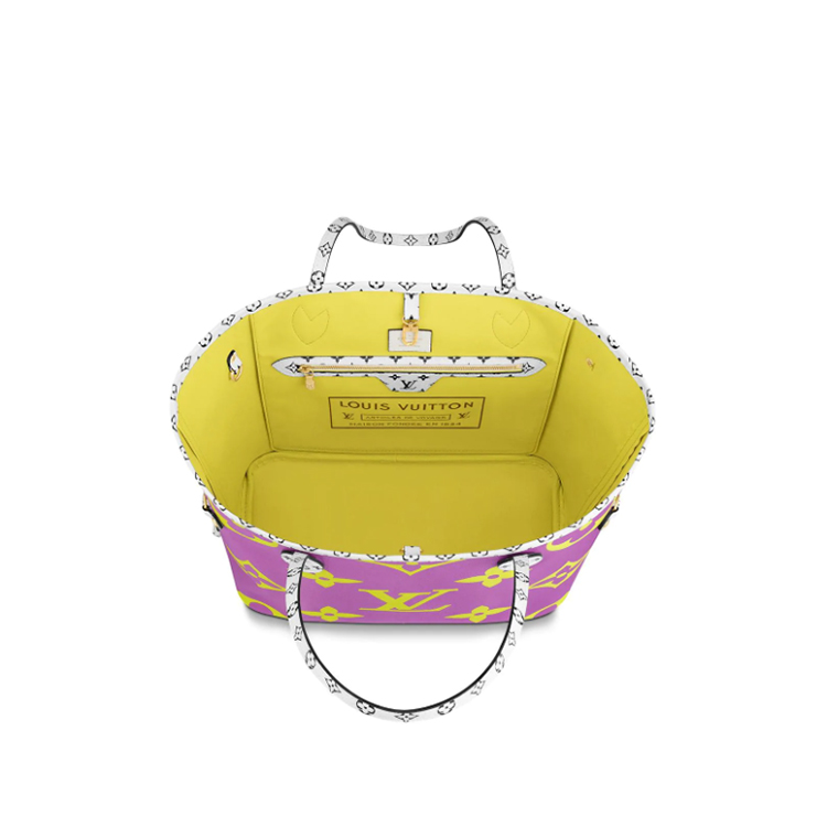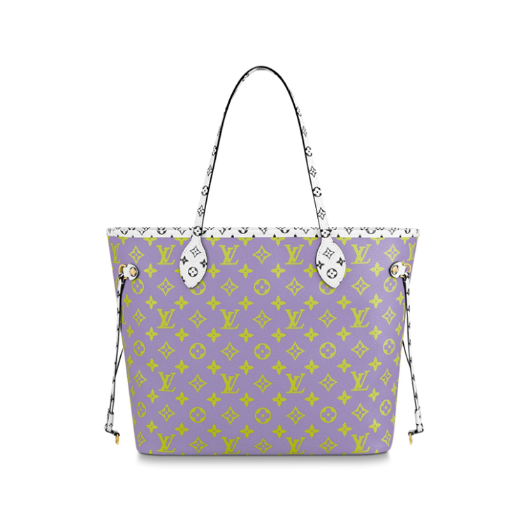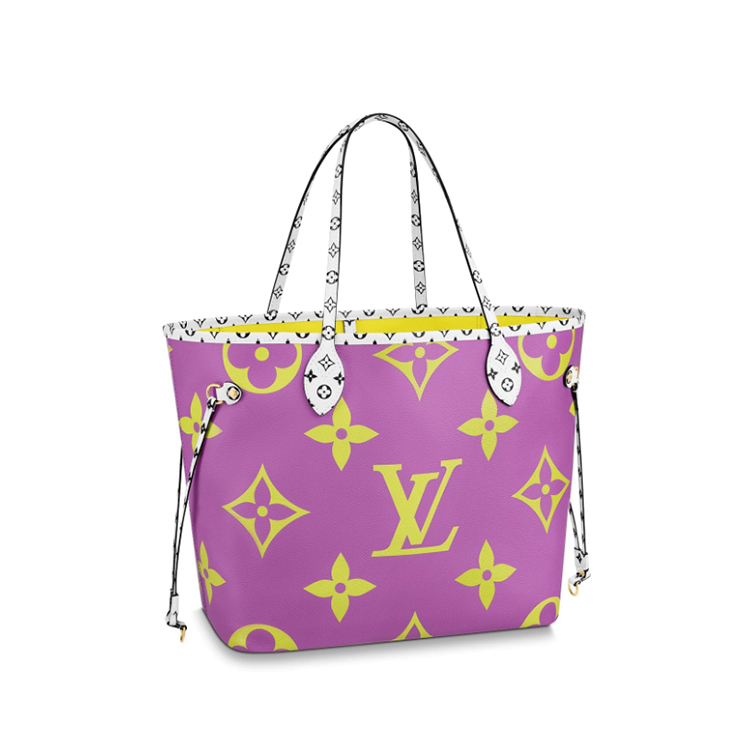 Playful, colorful, Neverfull: this season the iconic carryall wears a bold new spin on Monogram canvas. Oversized and Mini versions of the signature motif combine in sunny color palettes for a fun, summery look. Worn over the shoulder or carried on the arm, this MM model pairs perfectly with both beach and city looks.