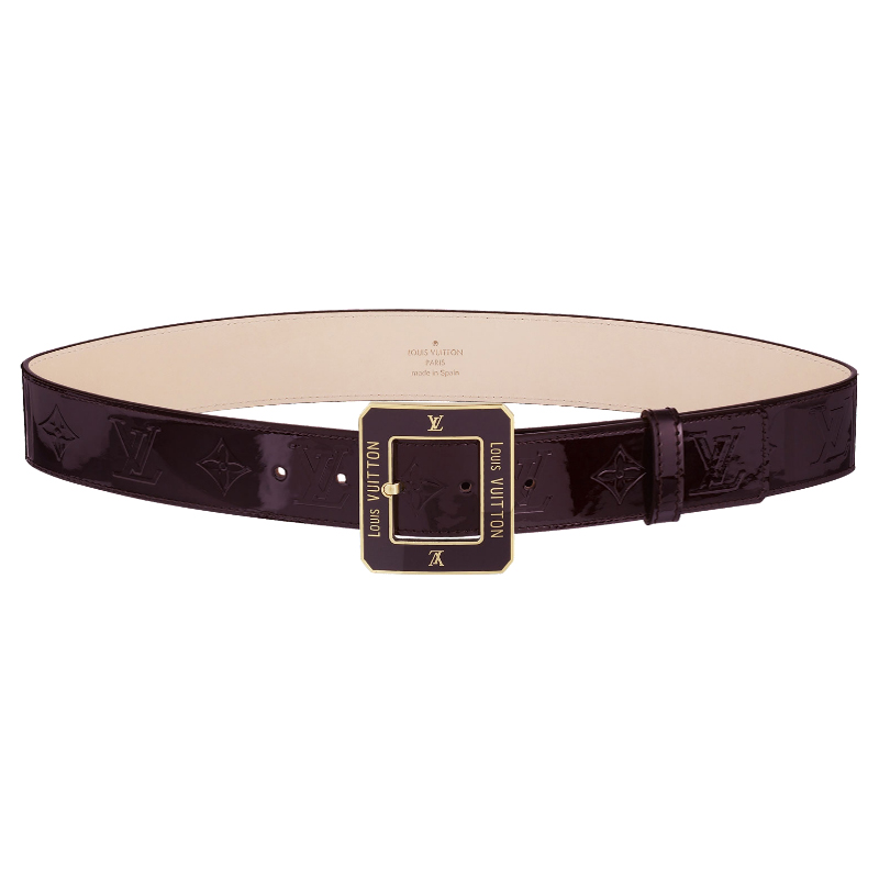 This sophisticated high-waist belt in glossy Monogram Vernis features a lacquered buckle inspired by a label found on a Louis Vuitton trunk from 1924. The buckle frames the LV logo embossed on the strap.