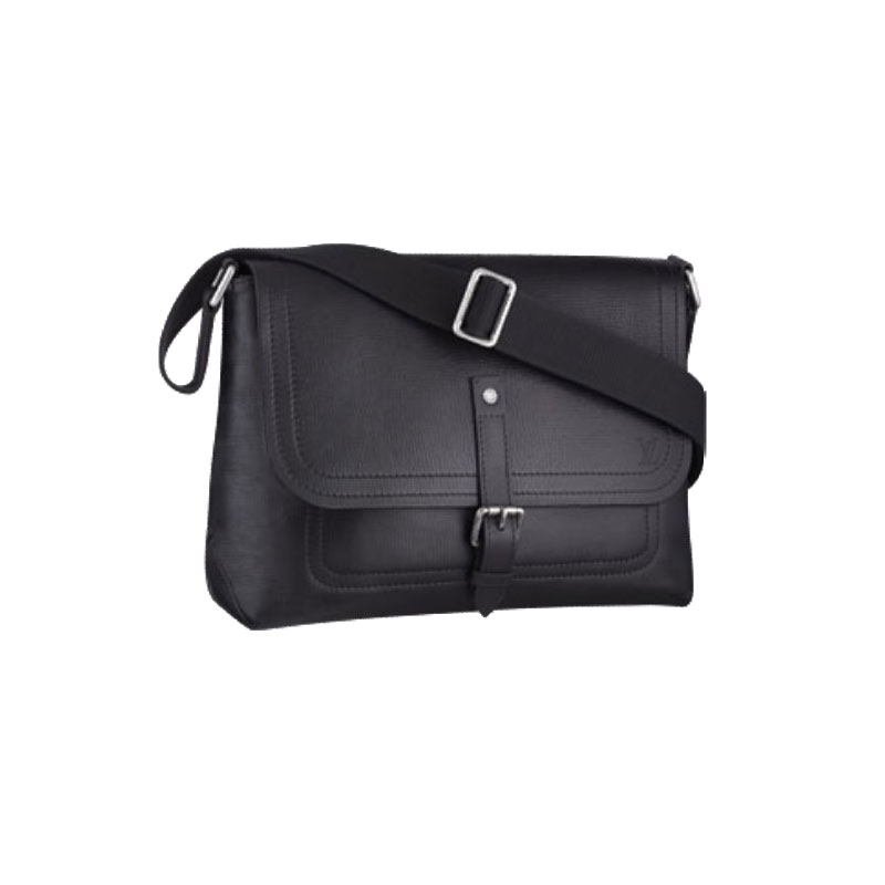 - Utah leather discreetly stamped with LV initials, rustic cotton lining, textile strap