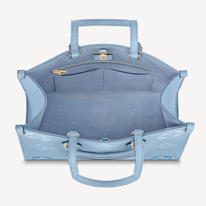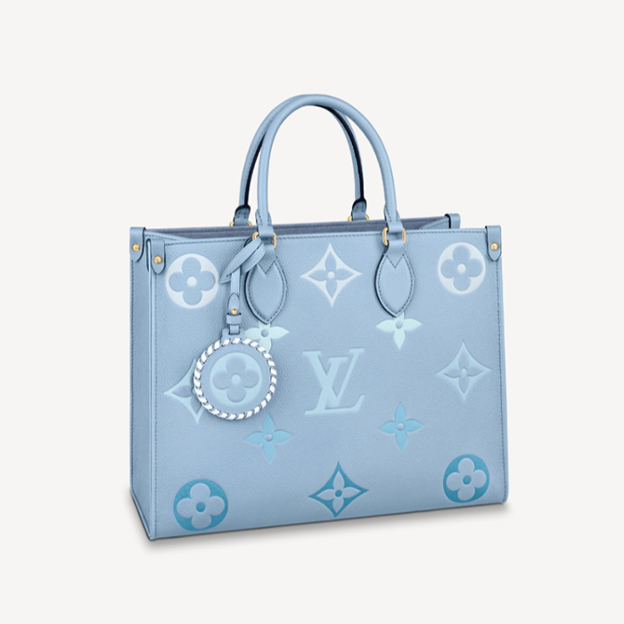 Made from a Monogram Empreinte leather with a subtle color gradient on the embossed Monogram pattern, the emblematic OnTheGo MM tote bag is part of the By The Pool capsule collection. It has two sets of handles, long and short, for hand and shoulder carry, and a spacious interior, which easily fits essentials such as a laptop. A leather charm gives a playful spirit and highlights the LV craftsmanship.