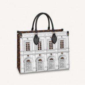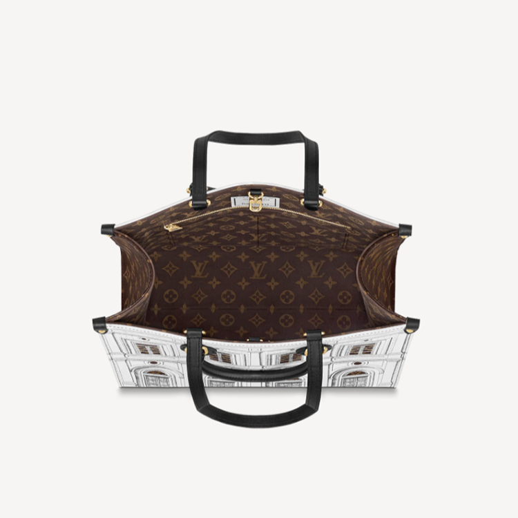 Part of the season LVxFornasetti capsule, this striking OnTheGo MM Architettura tote is crafted from printed matte calfskin, with Monogram canvas trim. The smooth leather mimics stone, upon which imaginary buildings are drawn in the signature Fornasetti manner. Fashion and function combine in this roomy carryall, ideal for office or city wear.