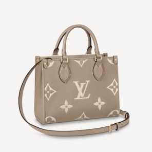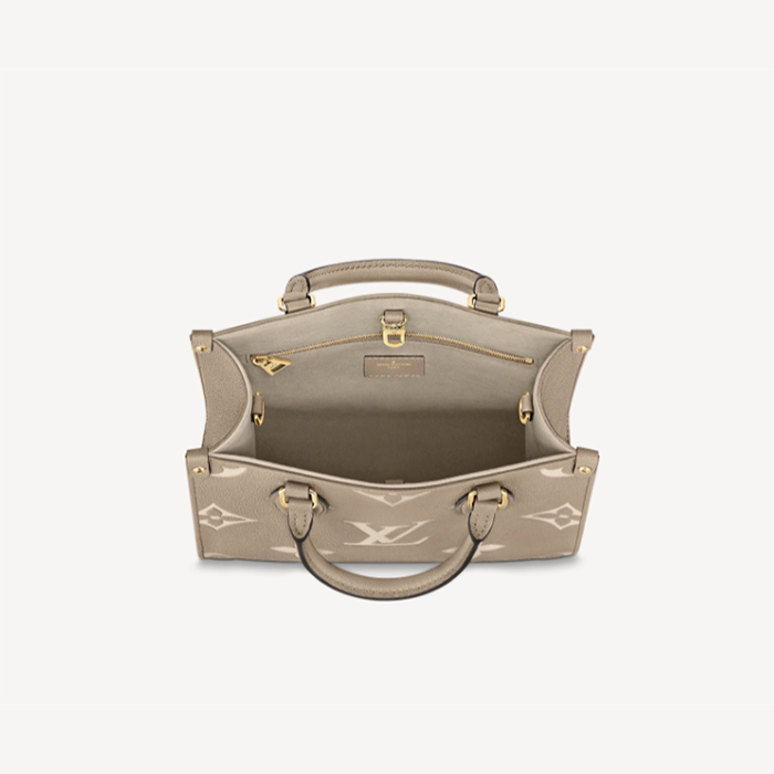 Inspired by Louis Vuitton鈥檚 famous Sac Plat from 1968, the Onthego PM tote is fashioned in Monogram Empreinte leather, embossed with a Giant Bicolor Monogram pattern. This smaller version of the original Onthego fits essentials such as an iPad Mini. Articulated top handles and an adjustable removable strap offer a variety of carry options.