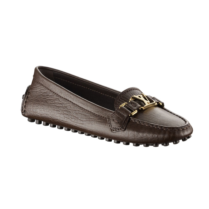 These elegant, feminine loafers in soft grained calf leather are discreetly signed with an LV initials accessory and sport an extremely supple rubber nub sole.
