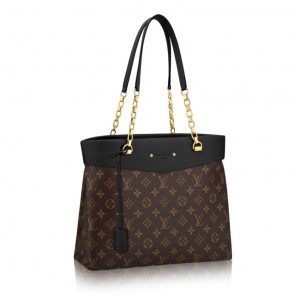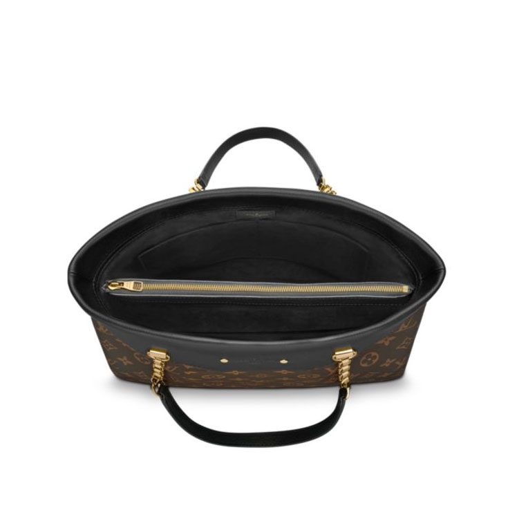A glamorous addition to the Pallas line, this new shoulder tote offers everything an active modern woman craves. The sleek feminine design combines Monogram canvas with deeply hued calf leather and luxe detailing, witness the gleaming chain and decorative rivets surrounding the embossed “Louis Vuitton Paris” signature. Thanks to an extra-roomy trapeze base, the bag transitions from pleasure to business, accommodating shopping-trip treasures alongside important documents or tablets.