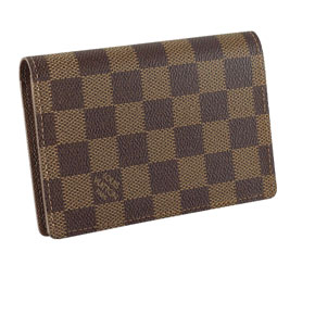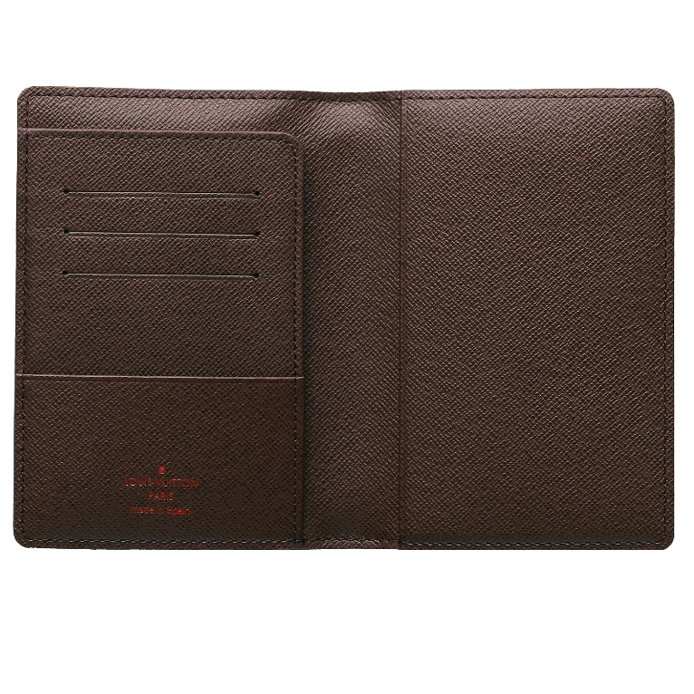 This passport holder in Damier canvas features various compartments to hold business cards and papers.