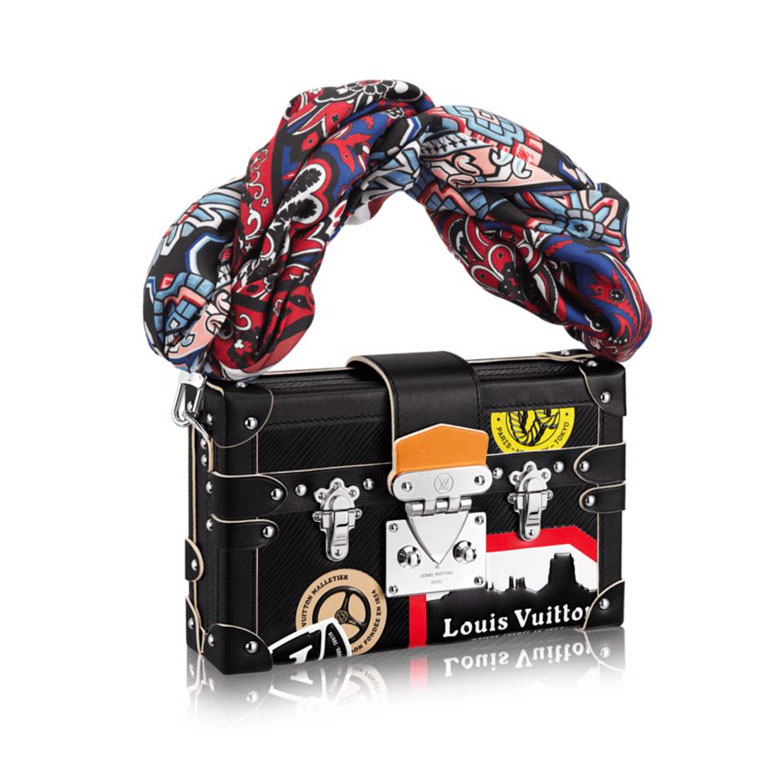 Ideal for a day-to-evening use thanks to its small but smart shape, this Petite Malle is adorned with Creative Director Nicolas Ghesquiere鈥檚 playful take on classic hotel stickers. Elegant and feminine removable scarf handle adds a delicate touch and matches ready-to-wear looks. Removable and adjustable leather strap allows shoulder or cross-body carry.