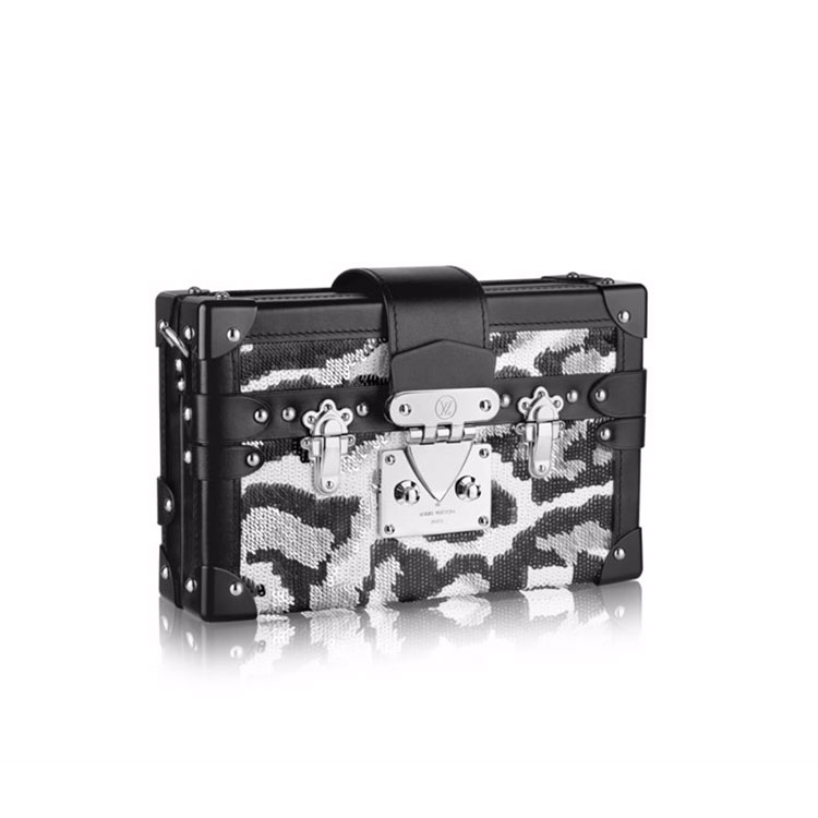 A precious minaudiere for the most glamorous evenings, this Petite Malle is dressed in a chic animal motif. The mix of matte and shiny sequins creates a deeply shimmering effect, set off by the black leather frame and silvery hardware. A masterpiece.