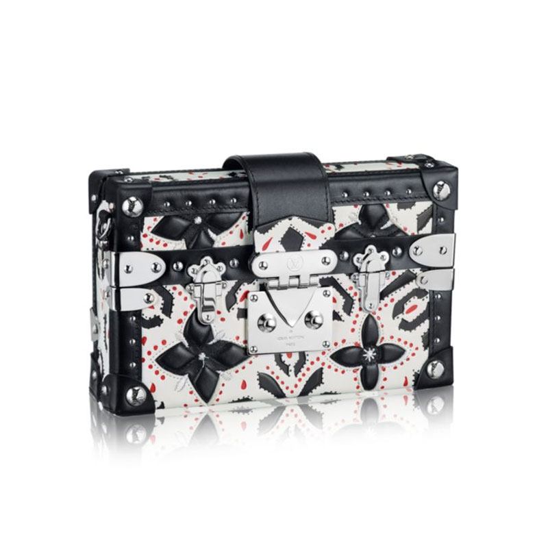 This Petite Malle, new from the F/W 15 runway, will delight aficionados of the Monogram Flower motif. The Graphic Print discretly reminds of the iconic Monogram pattern and covers the Petite Malle, matching ready-to-wear looks; embossed cowhide creates a dimensional effect. Details inspired by vintage Vuitton trunks – decorative rivets on the frame, the S-lock closure, the lining’s Malletage pattern – make this bag a must-have for collectors. Carried as a clutch or cross-body on the removable strap, it moves gracefully from day to evening.