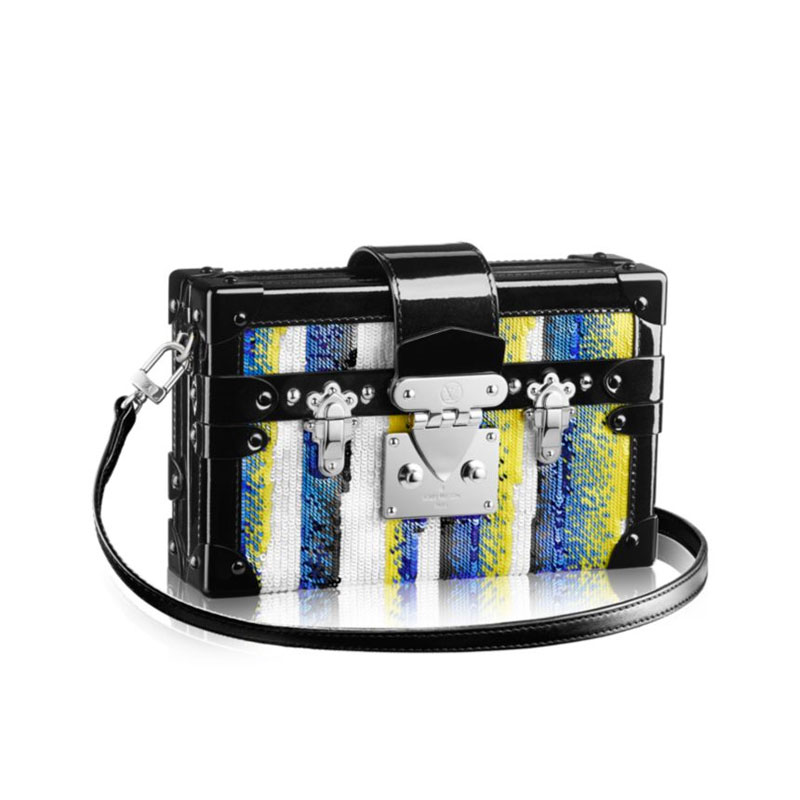 The Petite Malle Sequins is a miniature masterpiece. A mix of matte and glimmering sequins are embroidered to created patterns inspired from Ready-To-Wear looks of the Spring 2015 show making this bag the “it bag” for evening. Leather trim outlines the rectangular frame, the gleaming accents are modelled after the hardware of iconic Vuitton trunks. Designed to be carried as an elegant clutch or worn cross-body with its adjustable leather strap.