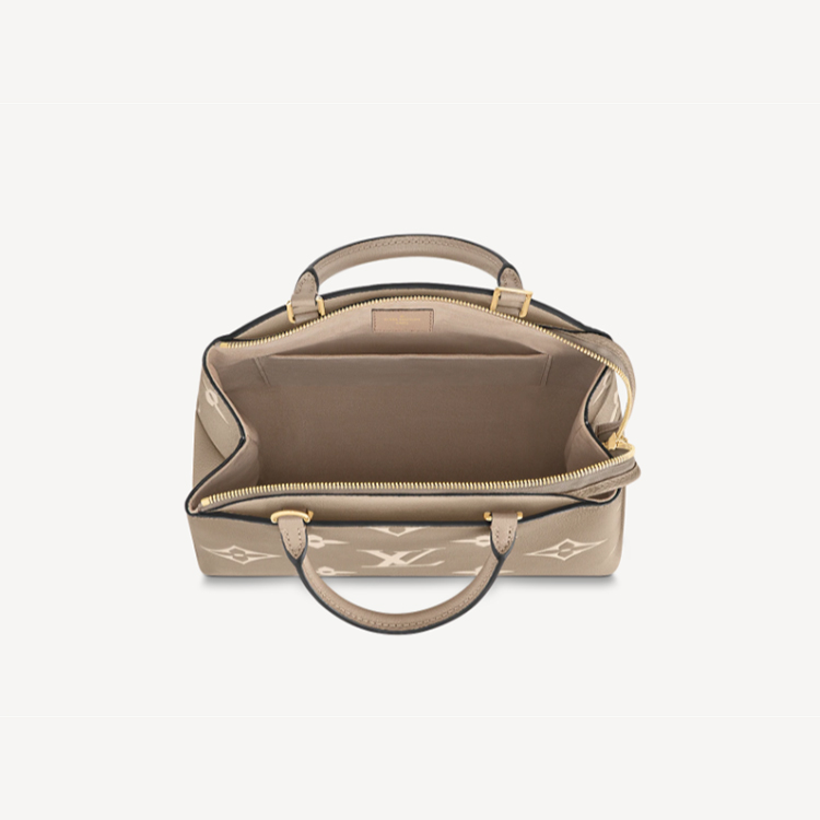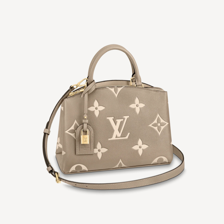 The perfect everyday companion, the smart and sophisticated Petit Palais handbag is fashioned from grained leather with an oversized pattern of Monogram Flowers and LVs printed and embossed on it. The gold-color padlock and leather name tag bring to mind the House legacy of fine luggage. A detachable strap can be adjusted for comfortable shoulder and cross-body wear.
