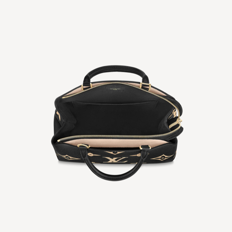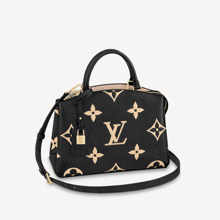 The perfect everyday companion, the smart and sophisticated Petit Palais handbag is fashioned from grained leather with an oversized pattern of Monogram Flowers and LVs printed and embossed on it. The gold-color padlock and leather name tag bring to mind the House legacy of fine luggage. A detachable strap can be adjusted for comfortable shoulder and cross-body wear.