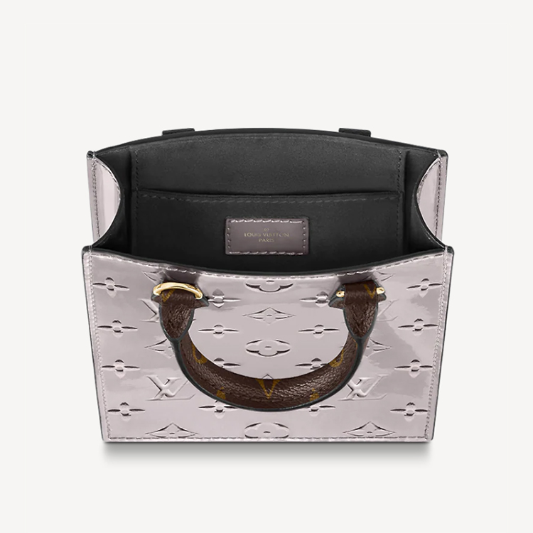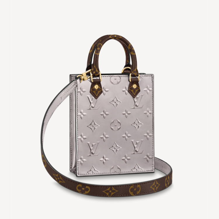 A miniature reinterpretation of Louis Vuitton's emblematic Sac Plat, the Petit Sac Plat is crafted from Monogram Vernis metallic patent leather, debossed with the iconic Monogram pattern. Its vintage-inspired design is complemented by Monogram canvas on the handles and removable shoulder strap. Lightweight and surprisingly spacious, this bag will hold everyday essentials, including a smartphone.