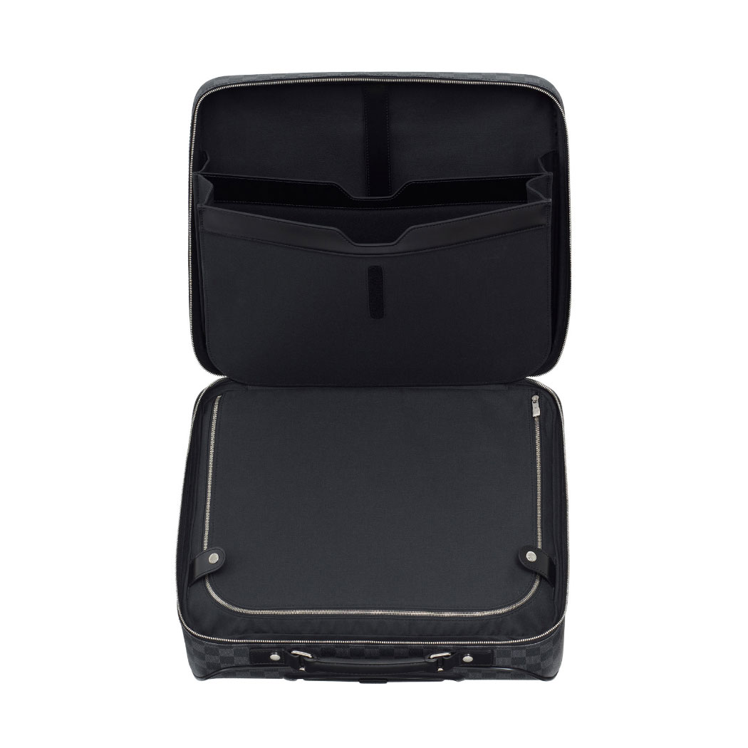 This cabin size Pilot case comes in Damier Graphite canvas. It has a practical, three level telescopic handle with lock-it button and a smart removable leather ID tag.