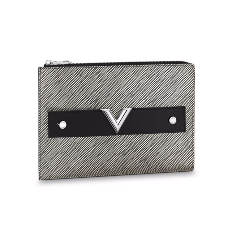 This edgy Pochette Plate in shiny metallic Epi leather comes with a fashionnable slot handclasp. When carried, this avant-garde Pochette Plate will adorn your hand with the essential V signature jewel.