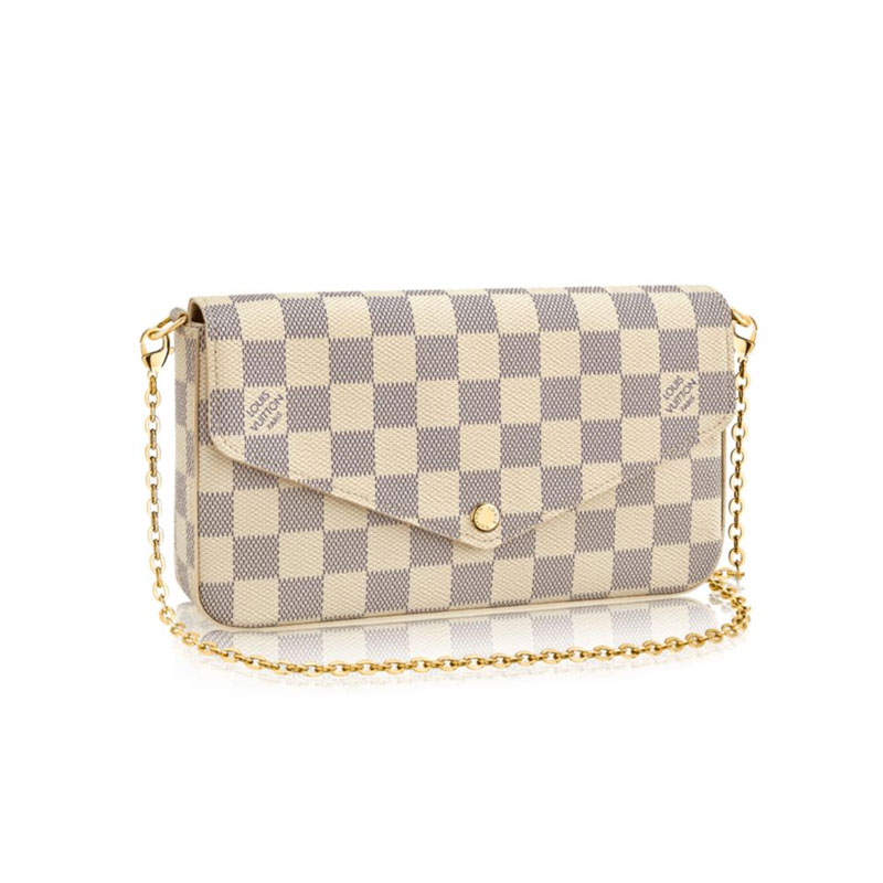 With its two removable interior pockets, the elegant Pochette Felicie in Damier Azur canvas is the stylish solution to carry and organise all your daily essentials. Much more than a wallet, it can be transformed into a glamourous shoulder bag or clutch thanks to its removable golden chain.